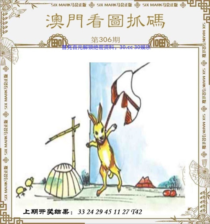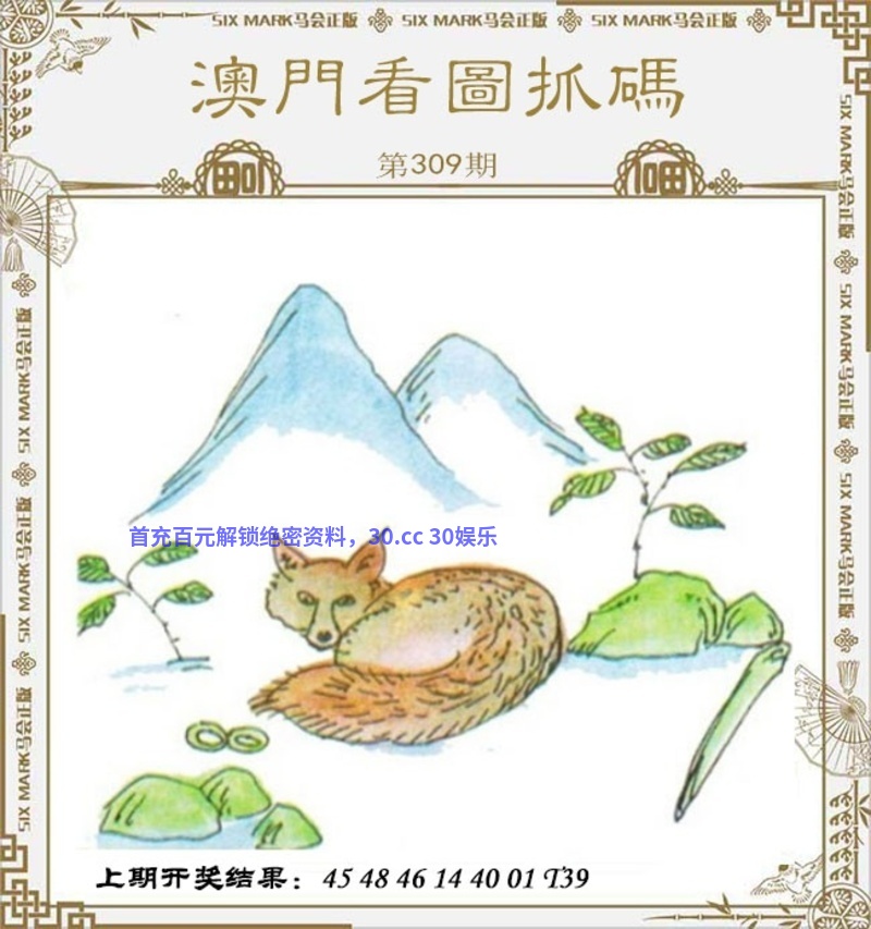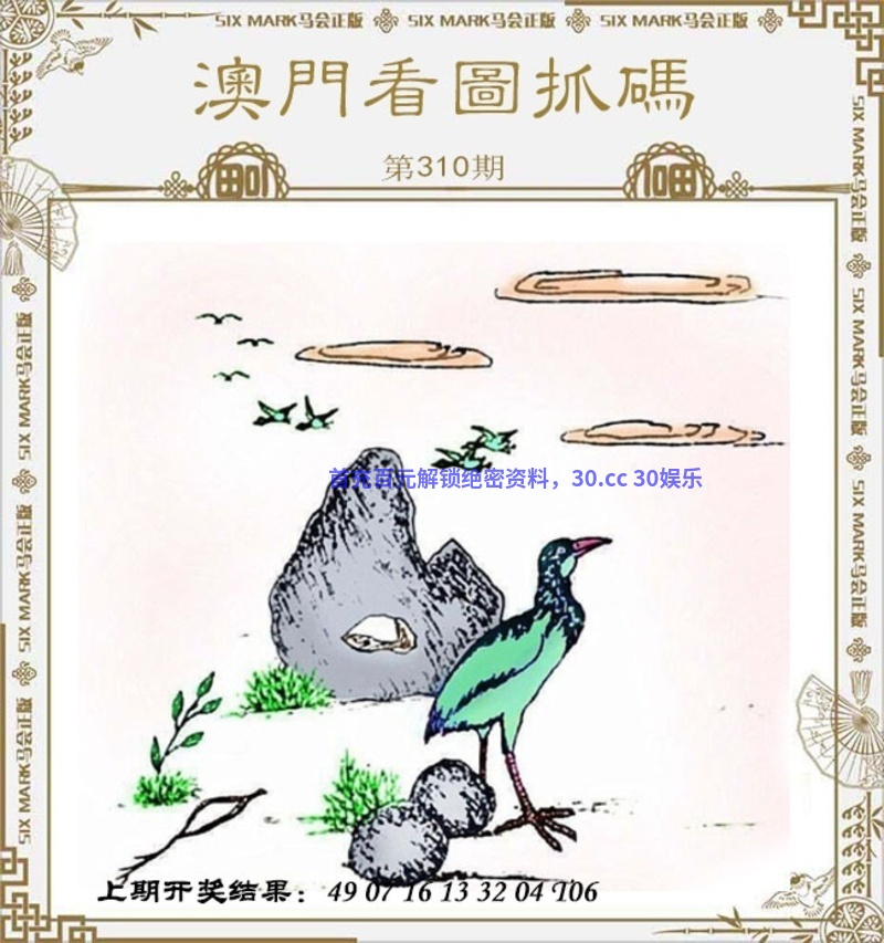 【妙解看图抓码】308期:图中有一位男子手拿着一个竹子看着前方的大乌龟,左右两边有四个人,远处有山有两只鸟和一座太阳。